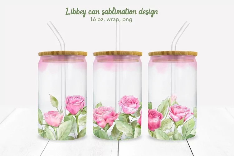 Pink libbey can glass sublimation designs with watercolor pink roses and green leaves