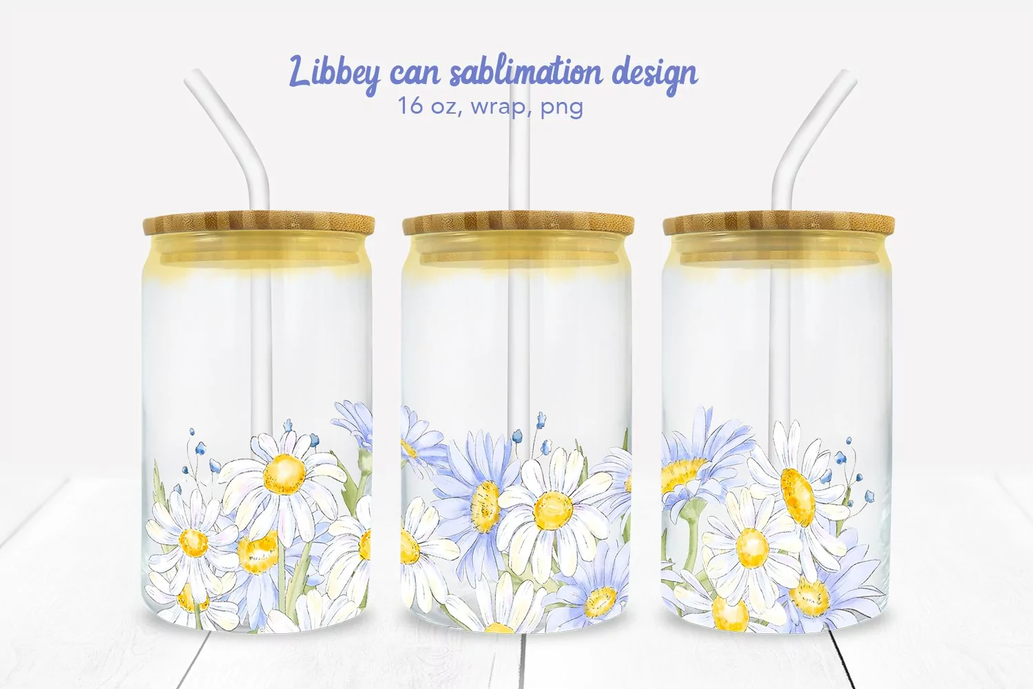 Cute libbey can glass sublimation designs with watercolor blue daisies and camomiles.