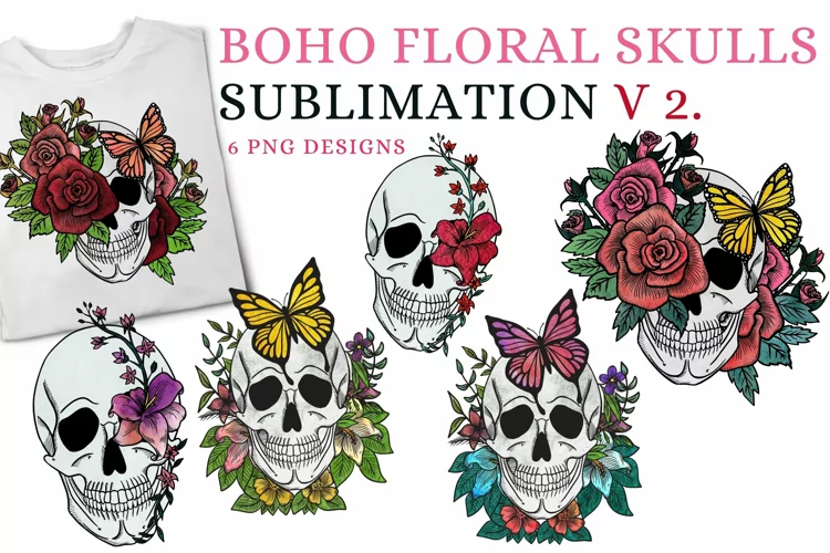 A new version of 6 mystical and beautiful boho floral skull clipart & sublimation designs! Features elegantly spooky skulls with floral elements such as roses, Lillies and butterflies.
