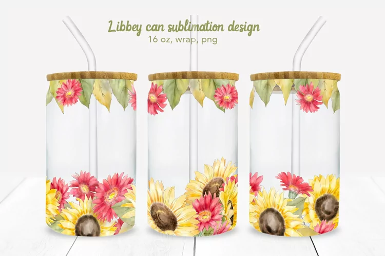 Bright libbey can glass sublimation designs with watercolor yellow sunflowers and pretty red daisies.
