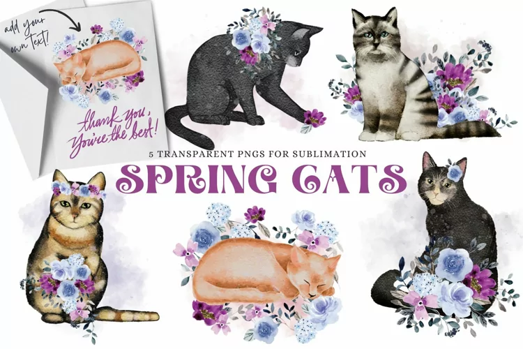 Just adorable! Introducing this set of hand drawn spring & floral cats in 5 beautiful scenes. Different positions, colors and features in this set of sweetly festive PNGs with transparent background purrrfect for sublimation! These kitties are surrounded my purple and lavender florals.