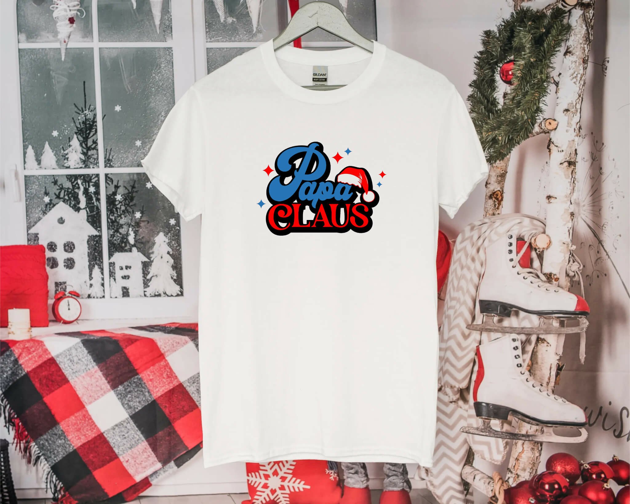 A fun and bright Christmas design with Santa hat. This Christmas design says, "Papa Claus" and will work well on t-shirts, hoodies and bags!