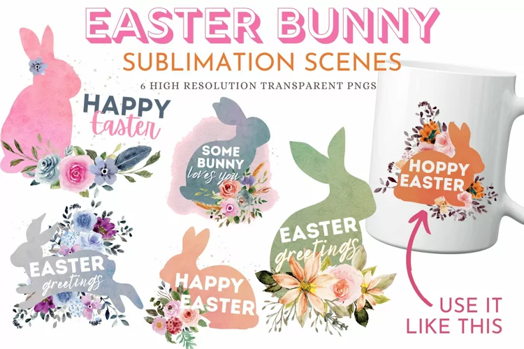 Adorable set of Easter bunny silhouettes themed designs in 6 festive scenes. Different positions, colors and features in this set of sweetly festive PNGs with transparent background and floral elements for the perfect springy design.