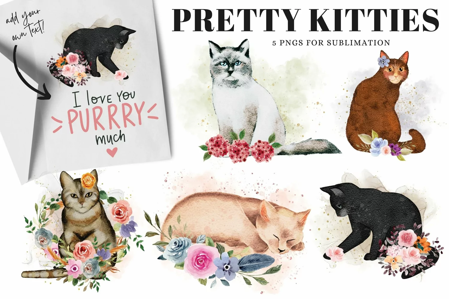 Fluffy and sweet set of hand drawn pretty kitties with florals and sparkles in 5 beautiful scenes. Different positions, colors and features in this set of sweetly festive PNGs with transparent background purrrfect for sublimation!