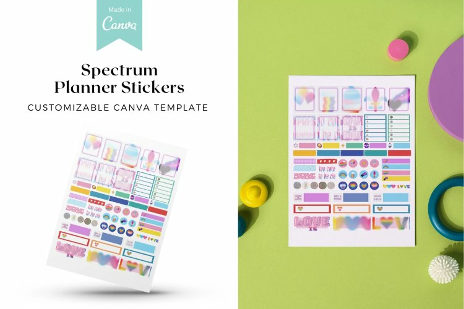 The Spectrum Planner Stickers Canva Template is a great way to make your planners more colorful! You can use the stickers to mark important dates and events. Get creative with this fun, colorful product today!