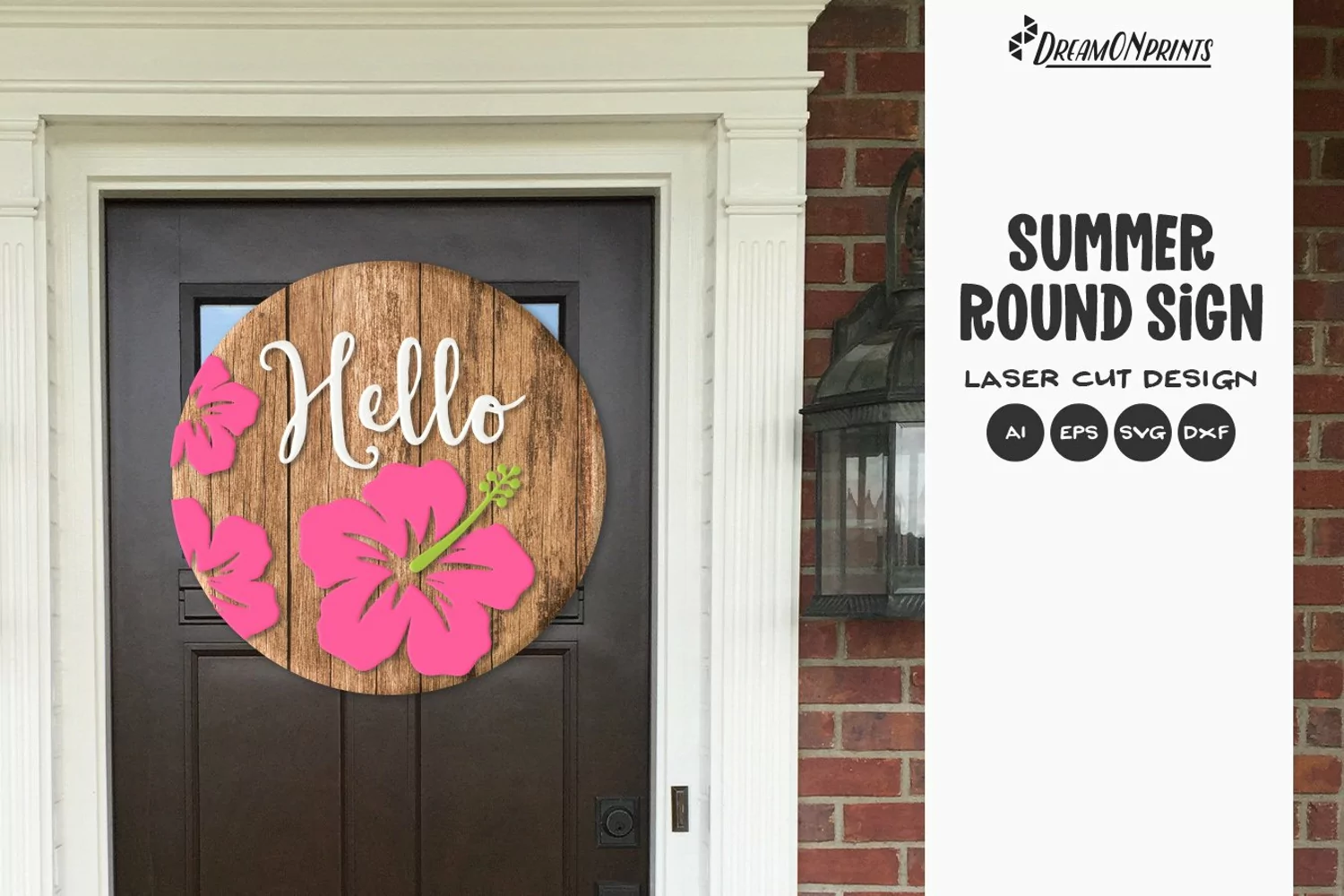 Round welcome sign made for laser cutting machines. It features hand drawn hibiscus flowers.