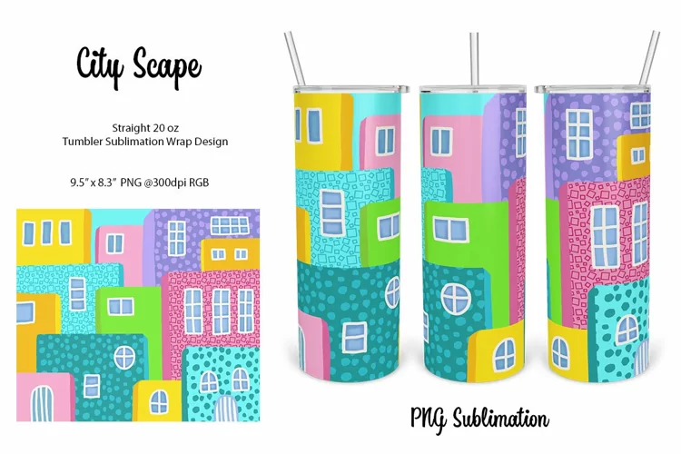Colorful city scape scene to suit 20 oz straight tumbler sizes.