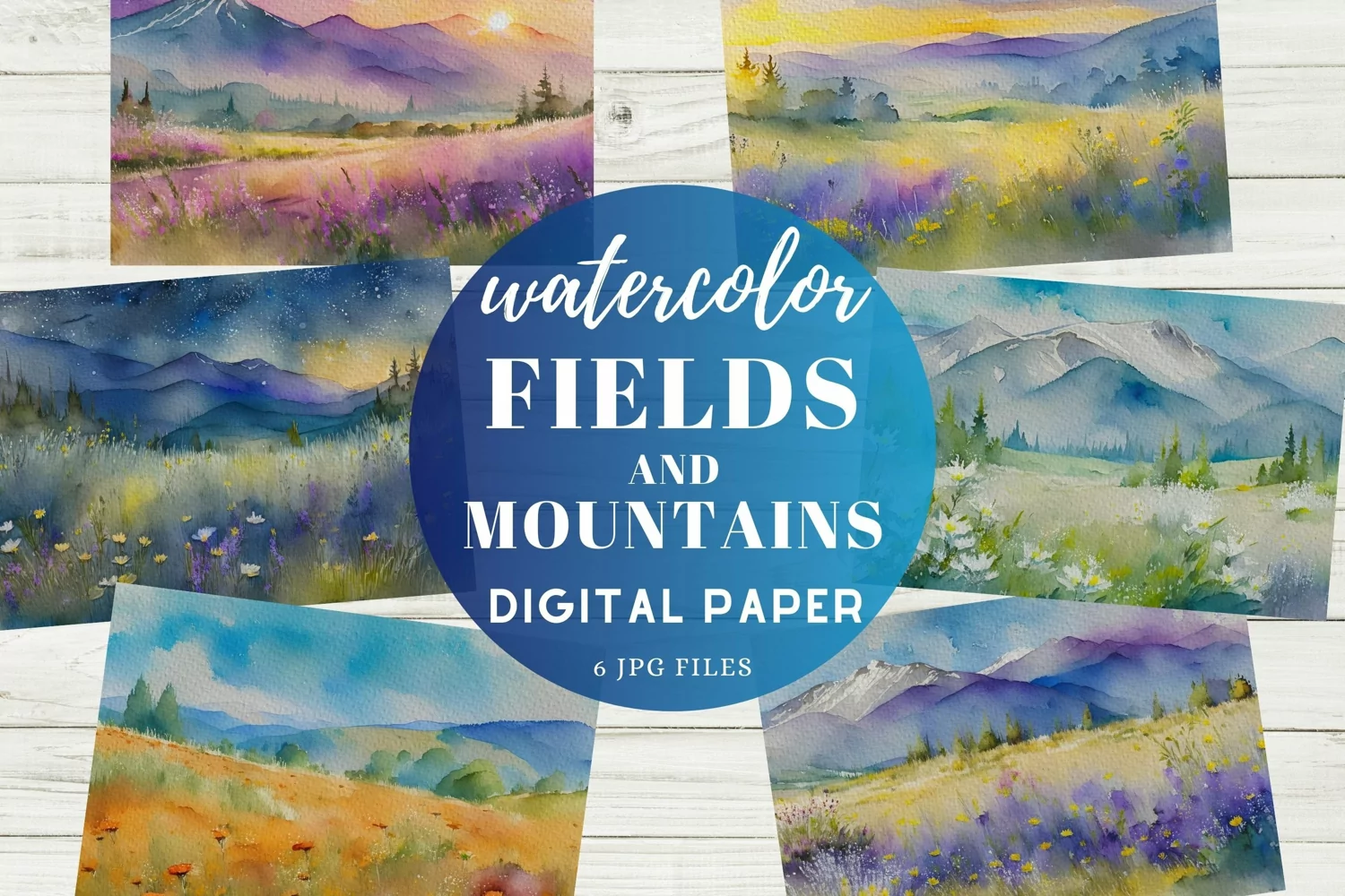 Immerse yourself in the serene beauty of nature with our Fields and Mountains Digital Paper collection. These 6 large JPG files have been meticulously crafted to resemble hand-painted watercolor, featuring enchanting landscapes of hills, mountains, wildflower fields, and distant forests.
