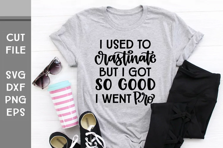 This is a hand lettered cut file. It reads, "I used to crastinate but I got so good I went pro."