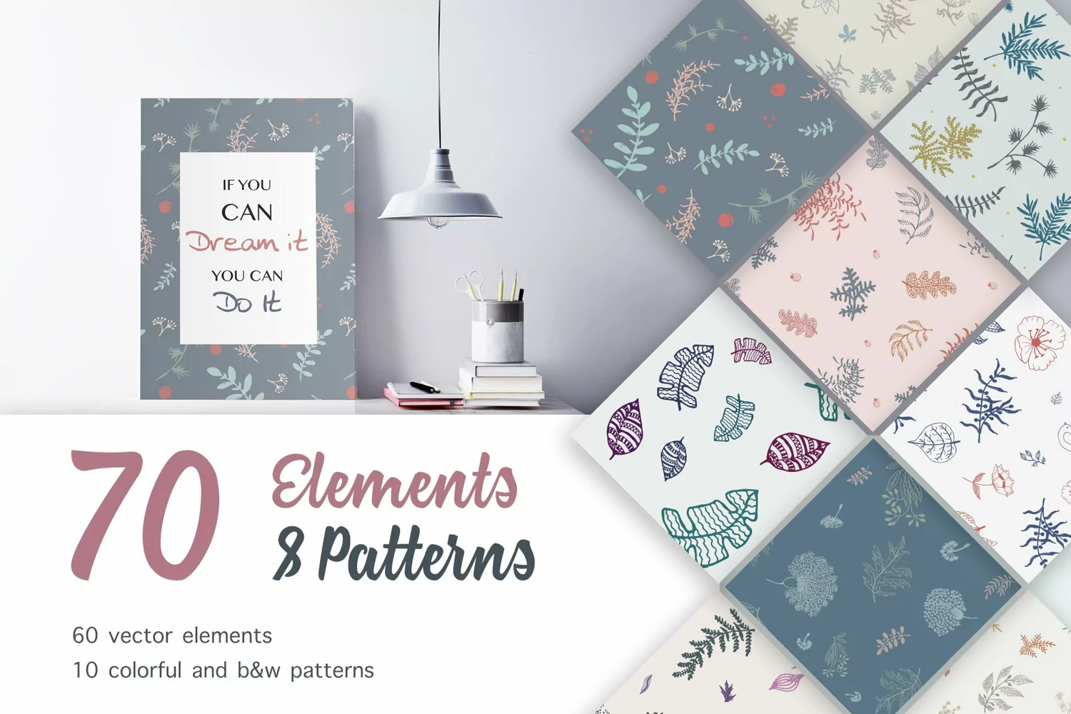 Set of delightful high quality hand drawn patterns and elements. Combine any elements from the set, they match with each other and create your own gorgeous artworks. My product is preferable for designing wallpaper, clothes, greeting cards, business cards, packaging, textiles, holiday decorations and so many others of your ideas!