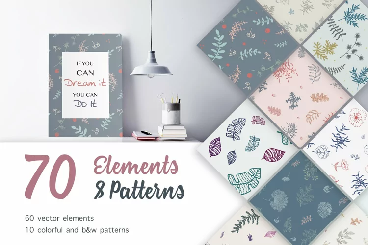 - 60 elements (leaves, flowers, birds and etc.) in AI format