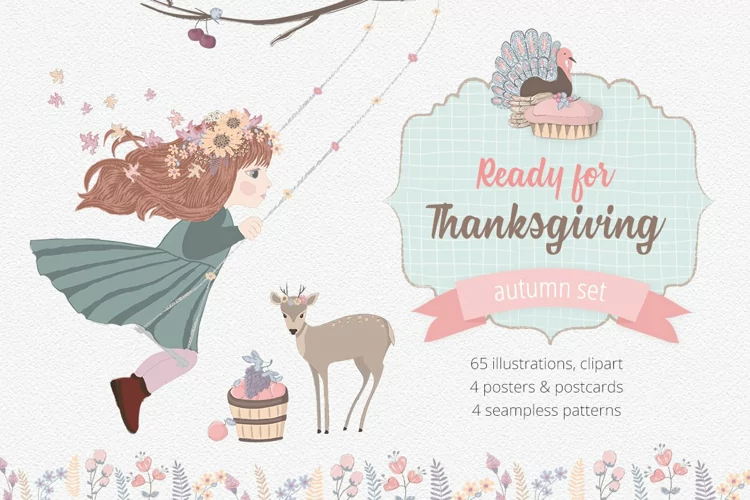 Cute Thanksgiving Day Fall Illustration Set includes sweet vector, fantasy drawing elements made in kids sketch style. Design created in cartoonish flat style in pastel Scandinavian colors. You can easily use poster with quotes for cards, prints, children books, birthday or anniversary events, invites, promotion, unique t-shirt prints, stickers, wallpaper design images or backgrounds and other artworks for sale or make them black and white and use for coloring book pictures or pages.
