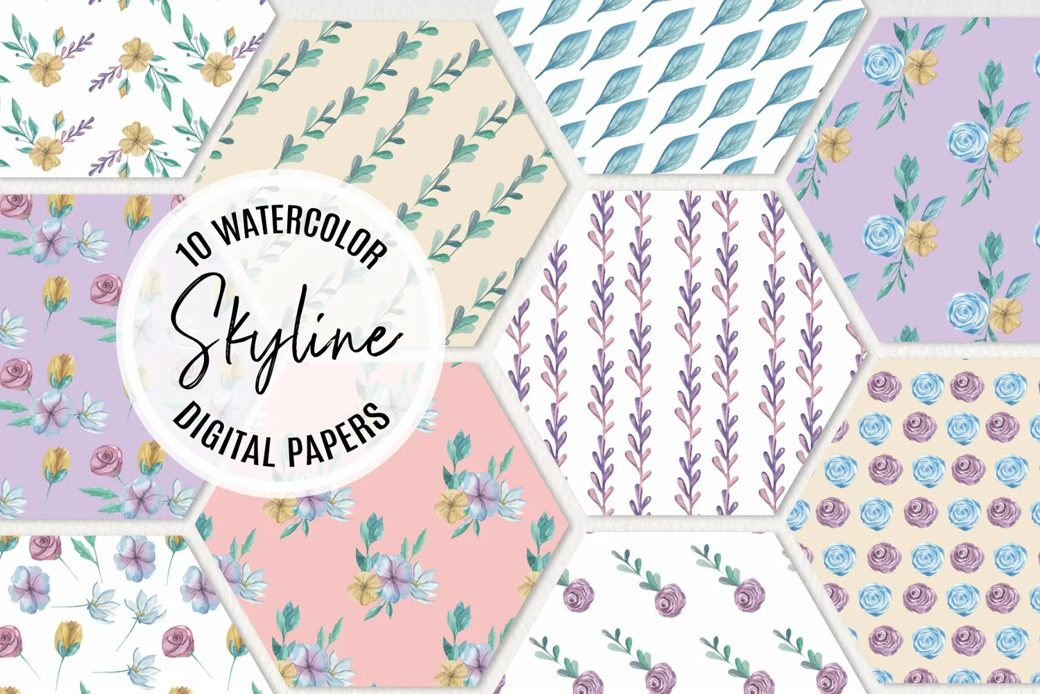 Flowers Skyline Seamless Patterns Digital Watercolor Floral example image 1