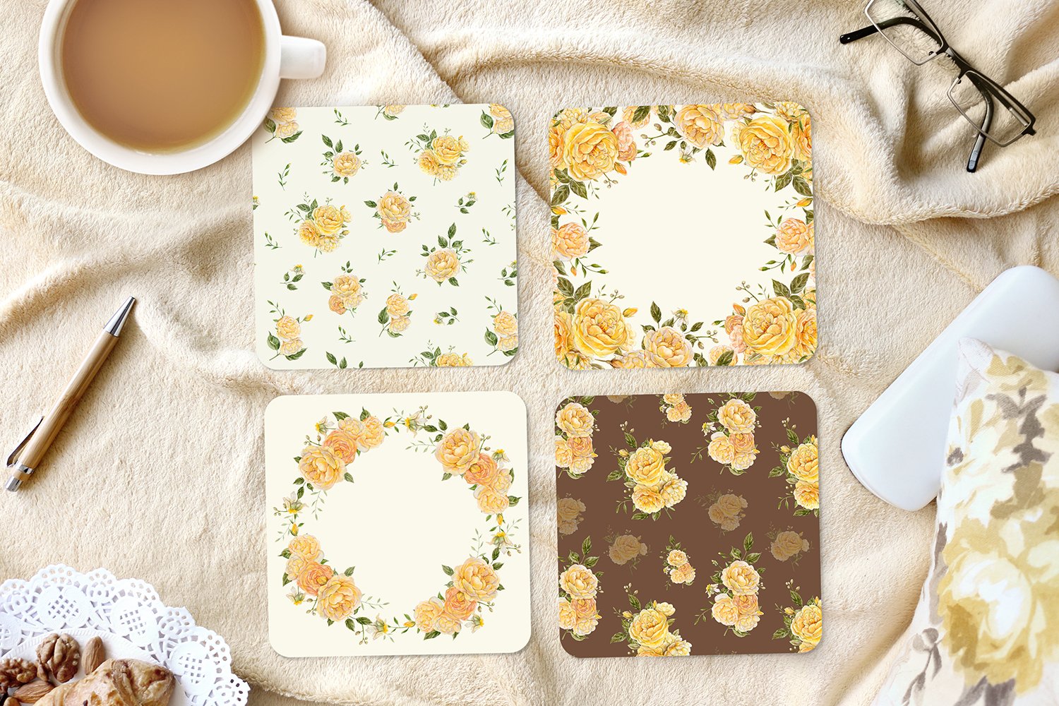 Are you ready to impress your customers by showing your new designs in action? Let this Cozy home style Coasters set mockup catch your customer's eyes!