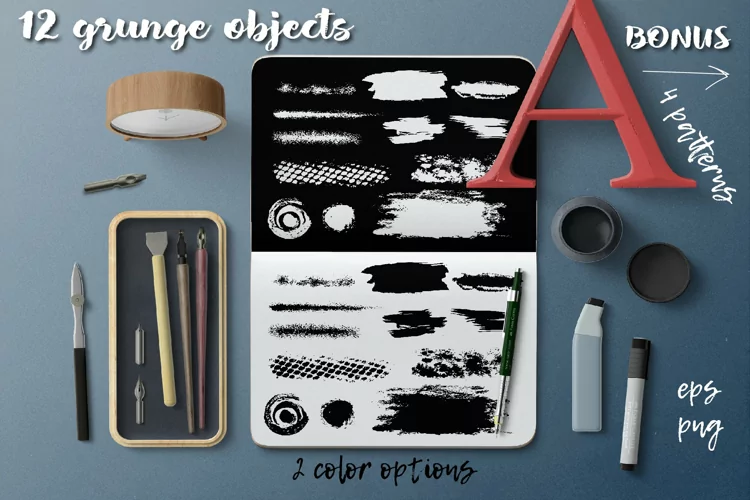 You can use it for Grunge objects set, gift cards, tags, labels, stickers, wedding invitations, header images, Font presentations, ideal for handmade craft items, scrap booking, printed paper items and more.. All elements are 100% hand drawn.