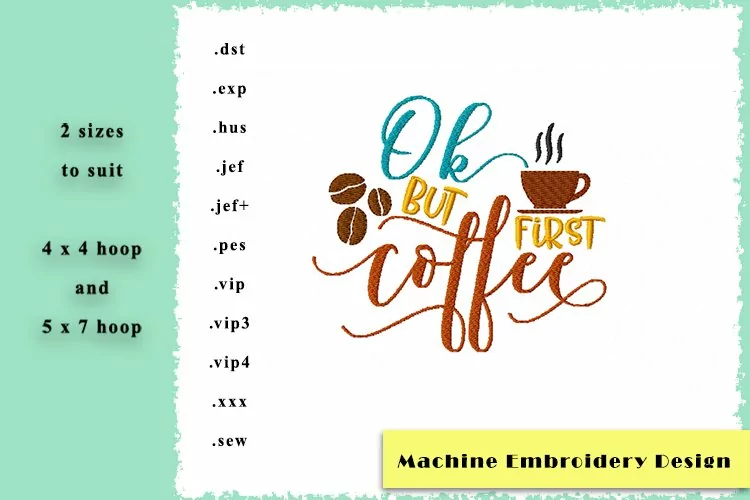 "Ok But First Coffee" Machine Embroidery Design in 2 Sizes