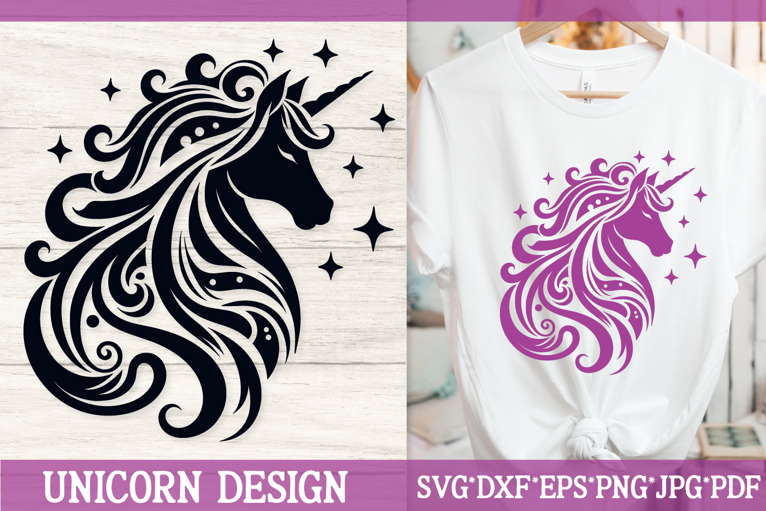 This Mystical Unicorn Silhouette SVG features an elegant unicorn profile with a flowing, intricate mane adorned with swirls and dots, complemented by magical sparkles. Perfect for fantasy lovers, children's décor, vinyl crafts, t-shirts, mugs, and more. F