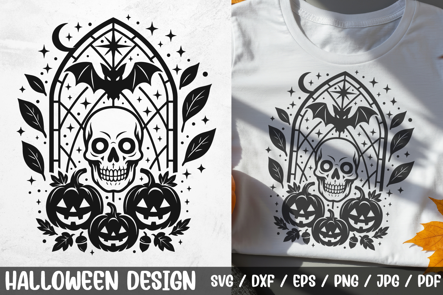 Halloween Skull Stained Glass SVG – a gothic black and white design featuring a skull, bat, and pumpkins inside a stained glass window. Perfect for creating t-shirts, hoodies, decor, posters, mugs, stickers, and other Halloween DIY projects.