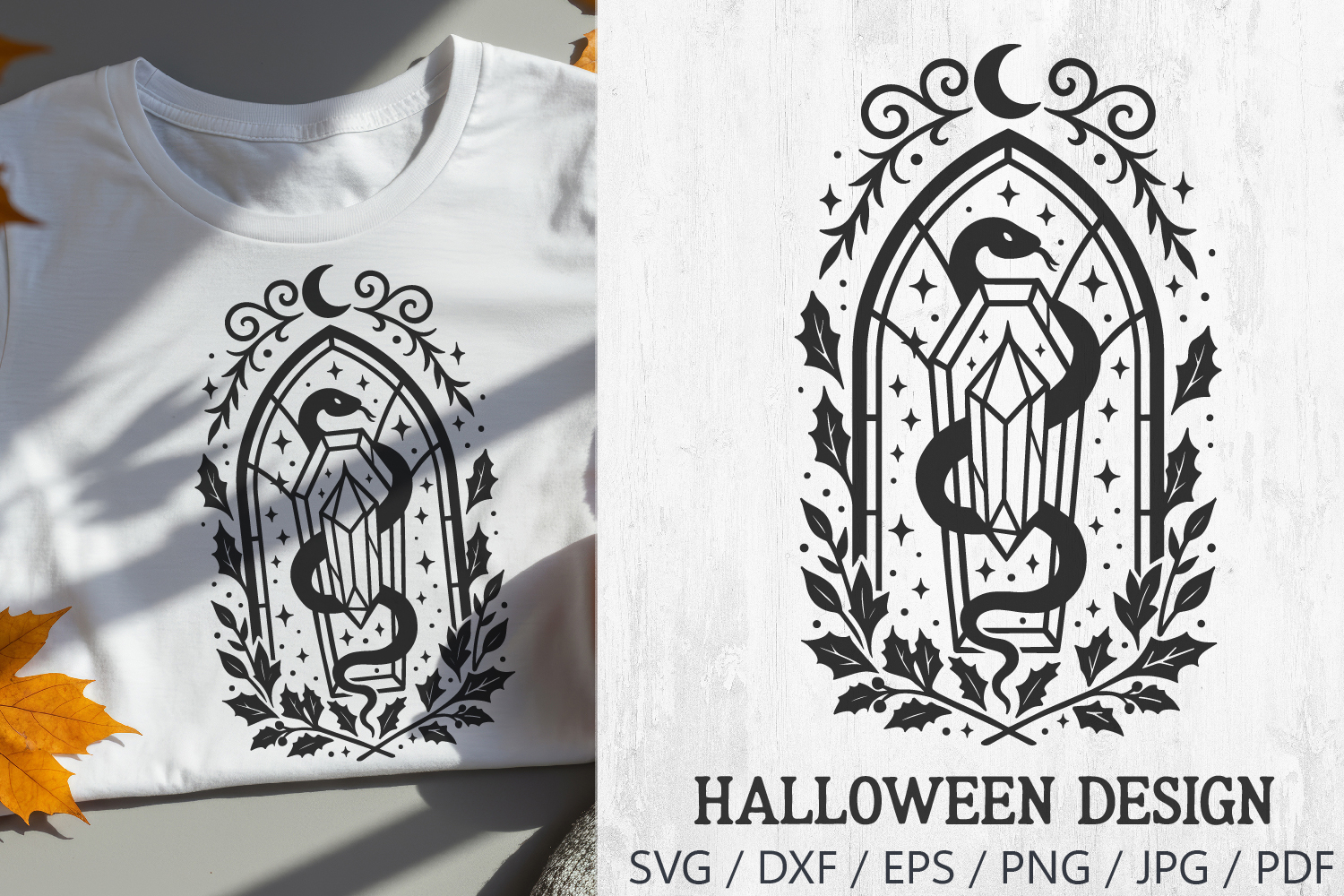 Gothic Snake Stained Glass Halloween SVG – spooky gothic style design featuring a snake coiling around a crystal inside a stained glass window frame. Decorated with stars, crescent moon, holly leaves, and mystical details. Perfect for Halloween shirts, go