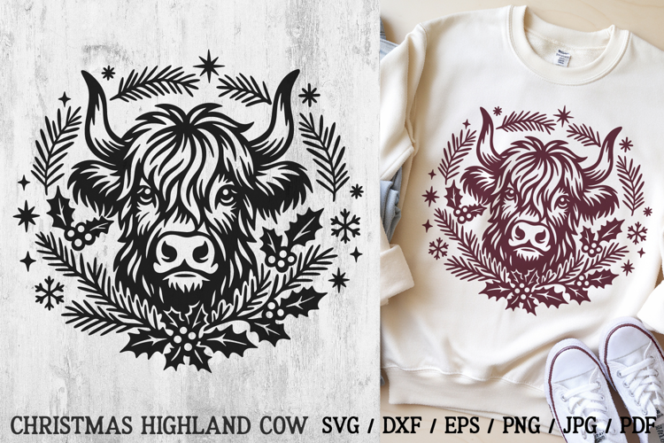 Christmas Highland Cow SVG – a festive design featuring a cute Scottish cow, decorated with fir branches, holly, and snowflakes. Suitable for Christmas projects, including t-shirts, hoodies, sweaters, decor, mugs, stickers, posters, and holiday cards.