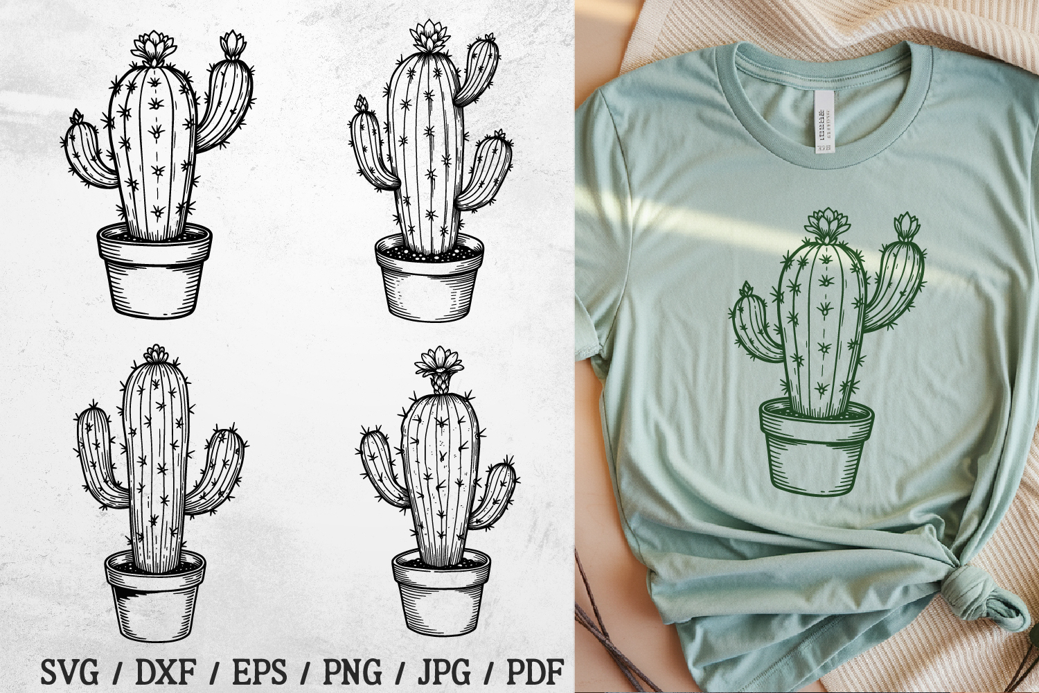 Enrich your craft projects with this Hand Drawn Cactus SVG Files: includes 4 unique potted cactus outline designs in vintage sketch style—perfect for shirts, mugs, tote bags, cards, wall art, stickers and boho decor.