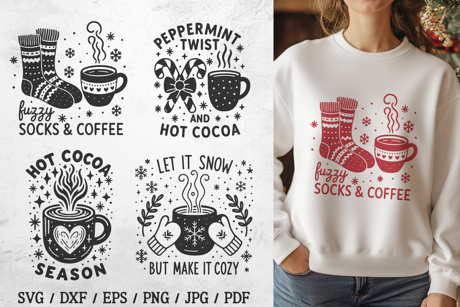 Create warm winter vibes with this cozy coffee and hot cocoa Christmas clipart SVG! The collection features fuzzy socks, peppermint, mugs, snowflakes, mittens, and cute hand lettering—ideal for shirts, mugs, Christmas cards, stickers, home décor, and holi