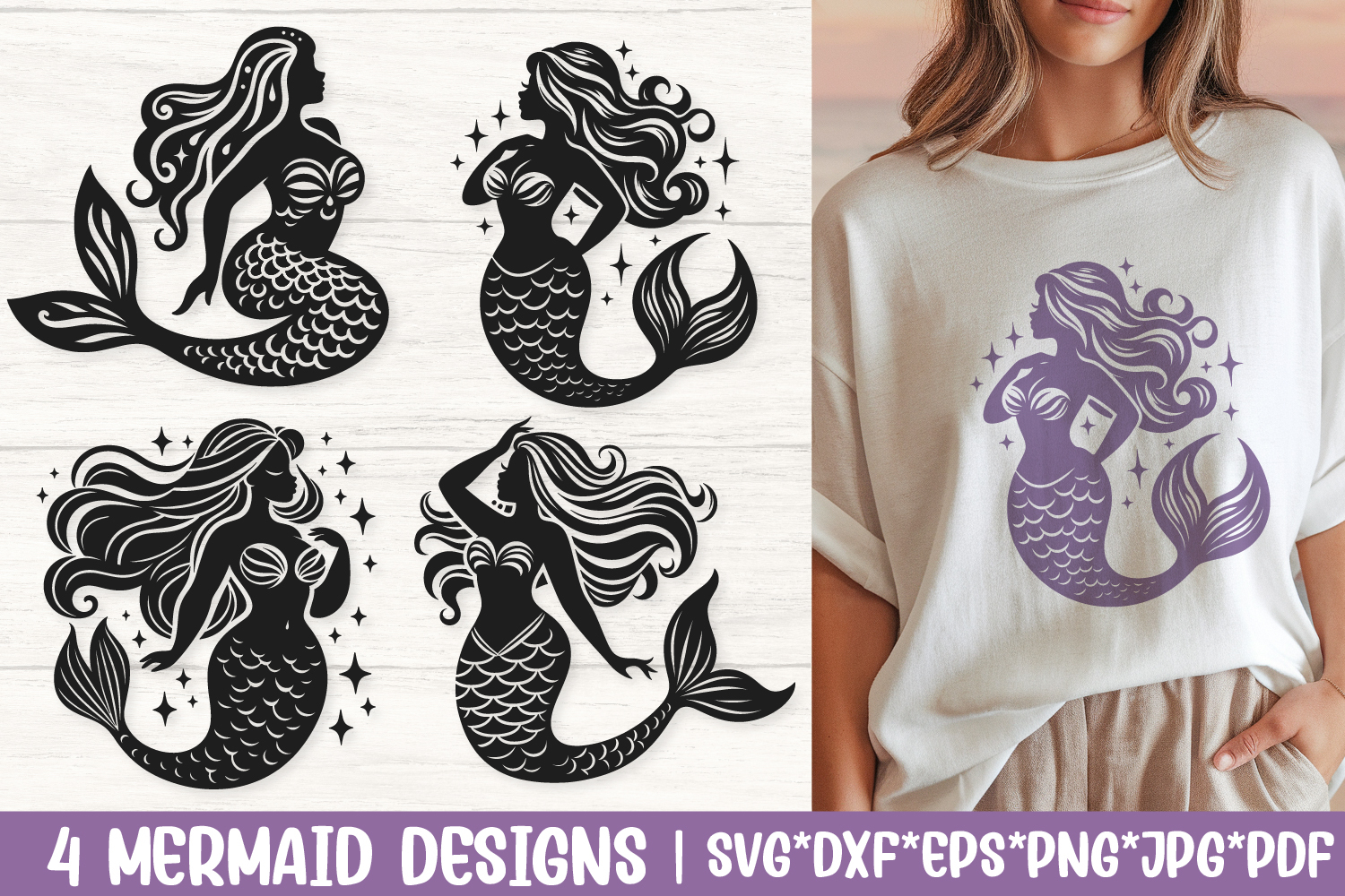 This Mermaid SVG Bundle features 4 graceful mermaid silhouette designs, perfect for beach crafts, fantasy projects, t-shirts, mugs, tote bags, and more. Designed for use with Cricut, Silhouette, and other cutting machines, this bundle brings an ocean of m