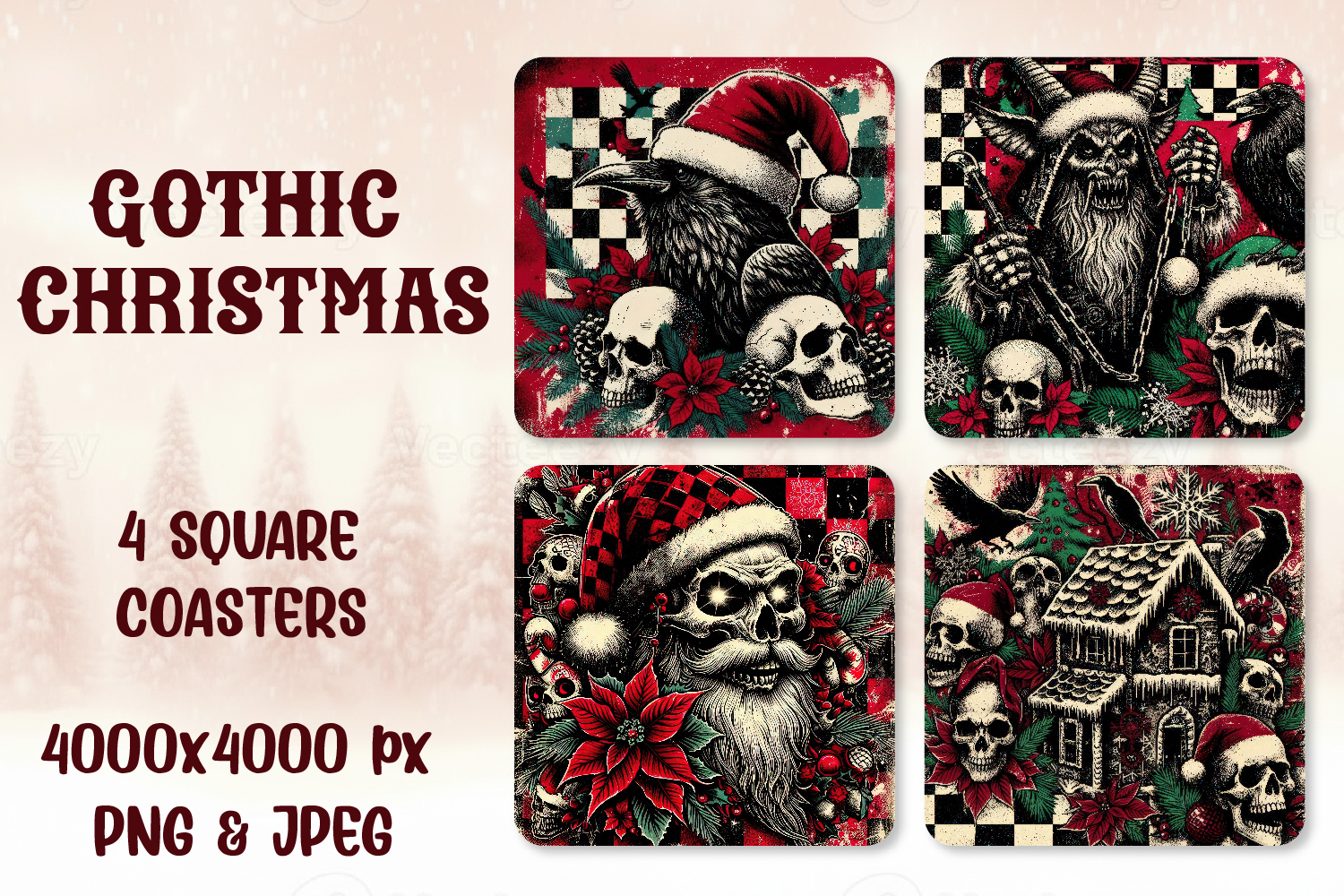 Gothic Christmas coasters featuring a raven in a Santa hat, Krampus, a haunted house with skulls, and a gothic Santa skull. Perfect for sublimation, crafts, and alternative holiday decor.