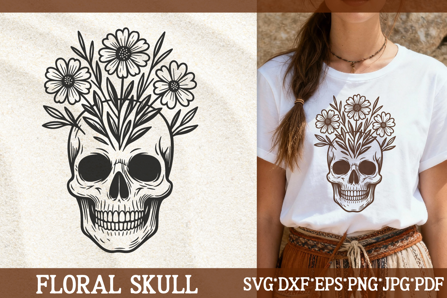 Give your DIYs a boho edge with this Floral Skull SVG files! Hand-drawn wildflower bouquet inside a detailed skull—perfect for t-shirts, Cricut/Silhouette crafts, posters, tattoos, mugs, stickers, wall art, and laser engraving.