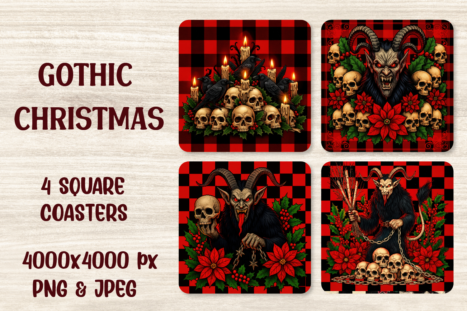 Create dark festive vibes with this Gothic Christmas Coaster PNG! Includes 4 square retro-buffalo-plaid designs featuring Krampus, skulls, candles, crows, holly and poinsettias—perfect for sublimation, mugs, party decor, gift tags, posters, and gothic holiday crafts.