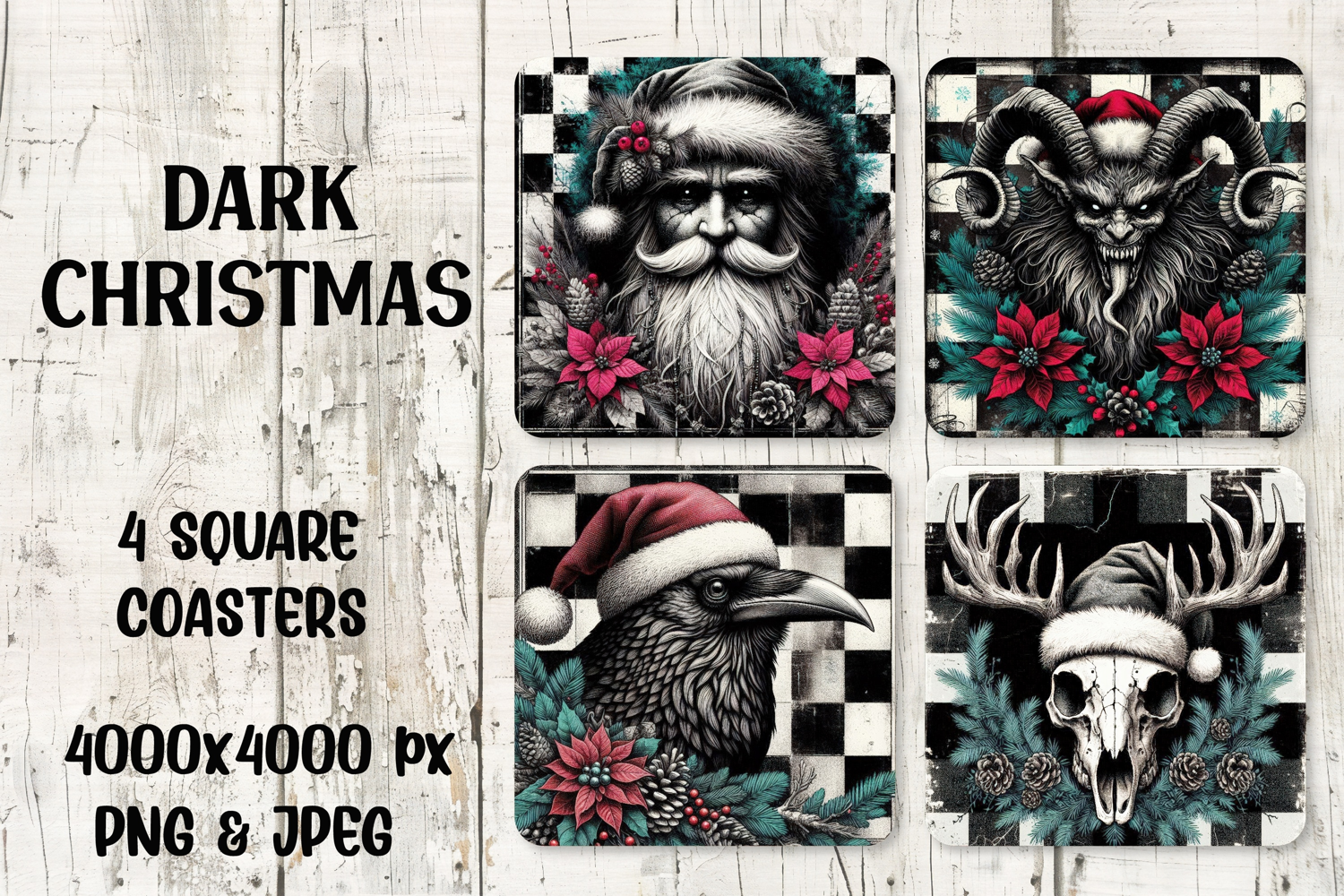 Dark Christmas coasters featuring a Gothic Santa, Krampus, raven with Santa hat, and stag skull with wreath. Perfect for sublimation, crafts, and alternative holiday decor.