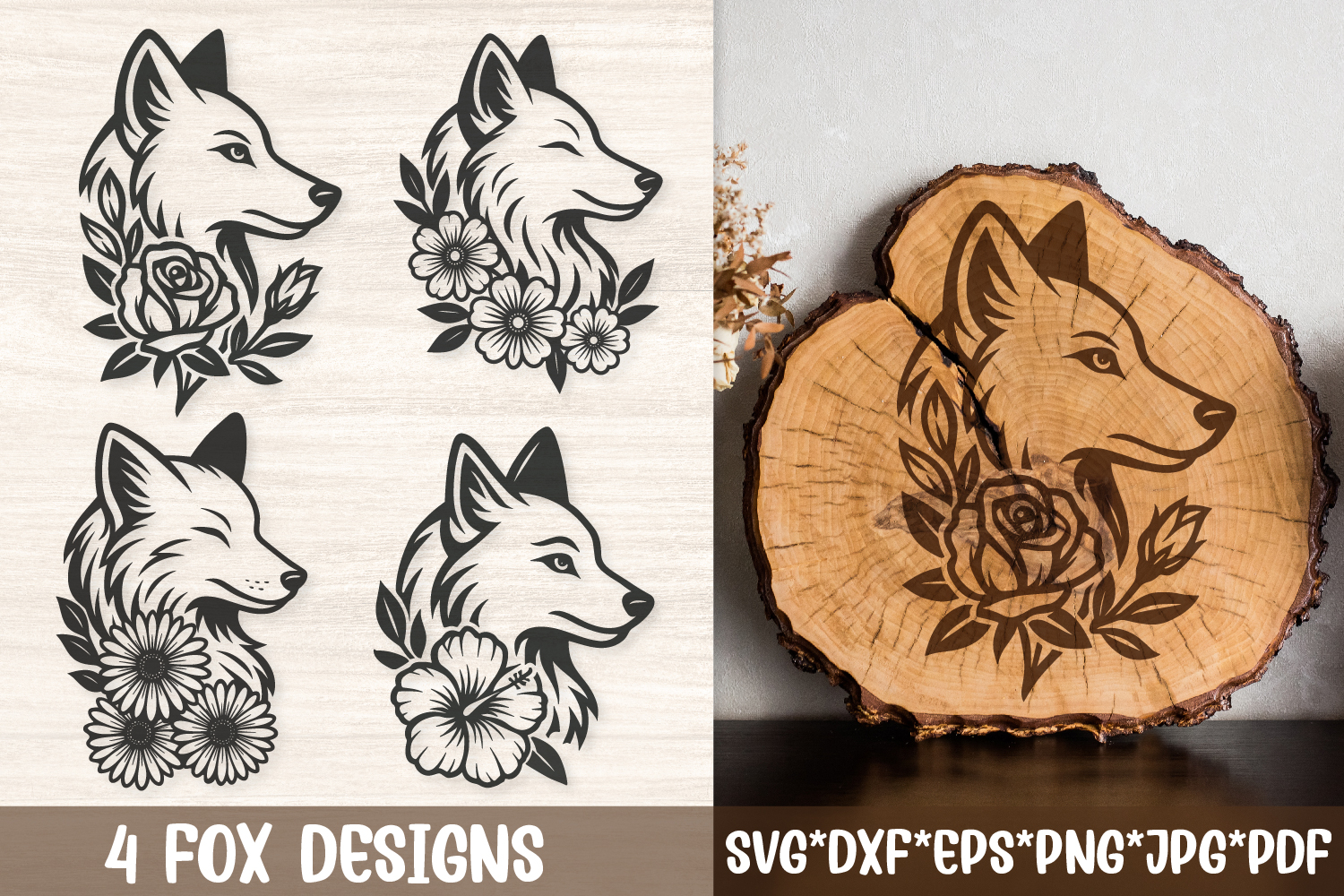 Elegant fox head floral SVG featuring 4 line-art profiles with roses, daisies, hibiscus, and wild leaves—perfect for Cricut/Silhouette, laser engraving, wood signs, shirts, mugs, decals, and rustic home decor. Clean paths, layered for easy sizing and color edits.