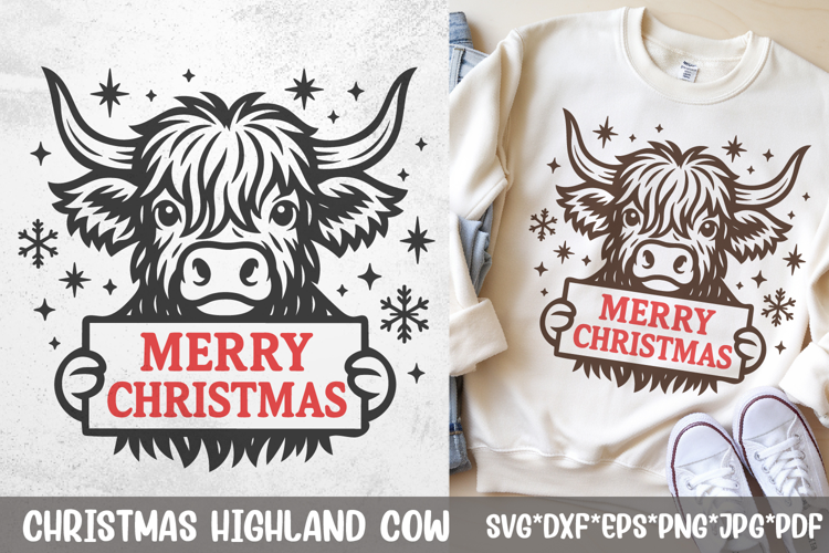 Cute Christmas Highland cow holding a “Merry Christmas” sign, surrounded by snowflakes—clean single‑color line art perfect for Cricut/Silhouette cuts, kid and farm‑style holiday shirts, mugs, tote bags, signs, stickers, and laser engraving. Paths optimized for easy weeding and color layering.