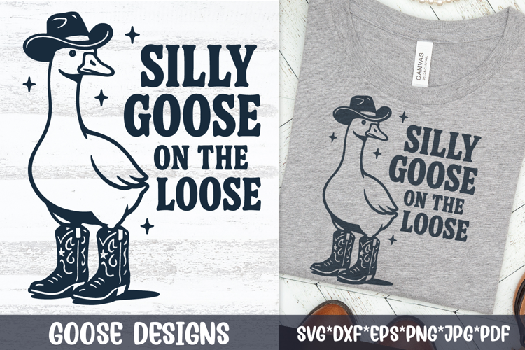 “Silly Goose On The Loose” design—goose wearing cowboy hat and boots with bold vintage lettering, SVG set for cutters and print.