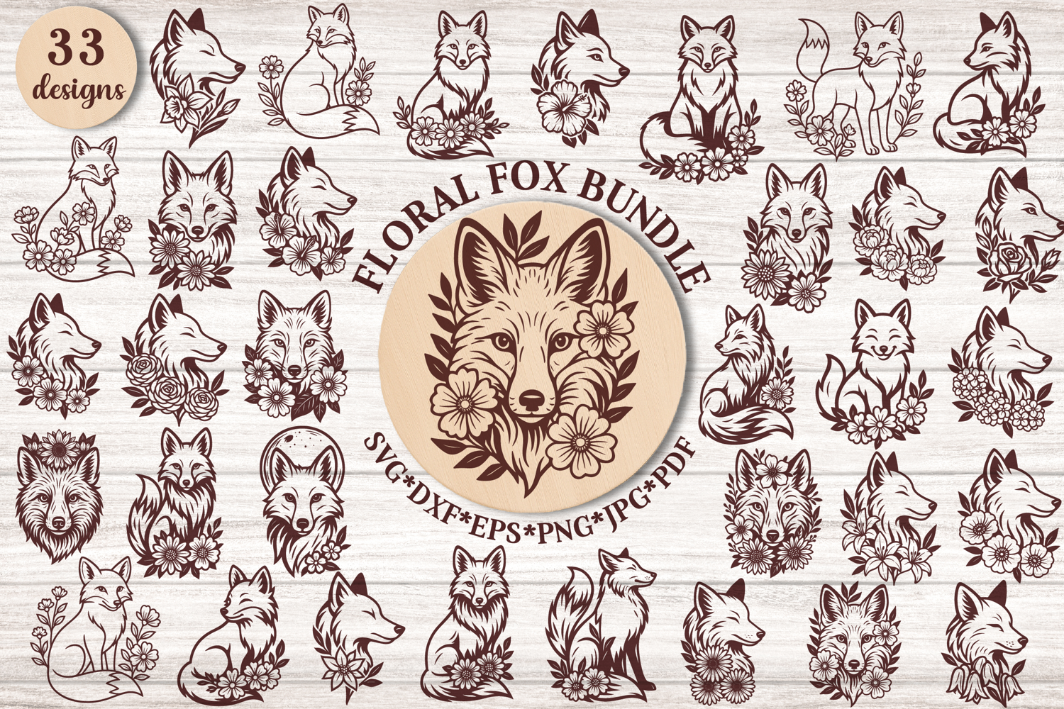 Floral Fox SVG bundle — 33 monoline foxes and fox faces with flowers, in various poses and floral styles. Perfect vector set for Cricut, Silhouette, engraving, laser cut, shirts, mugs, stickers, decor, nursery spring/fall crafts, gifts.