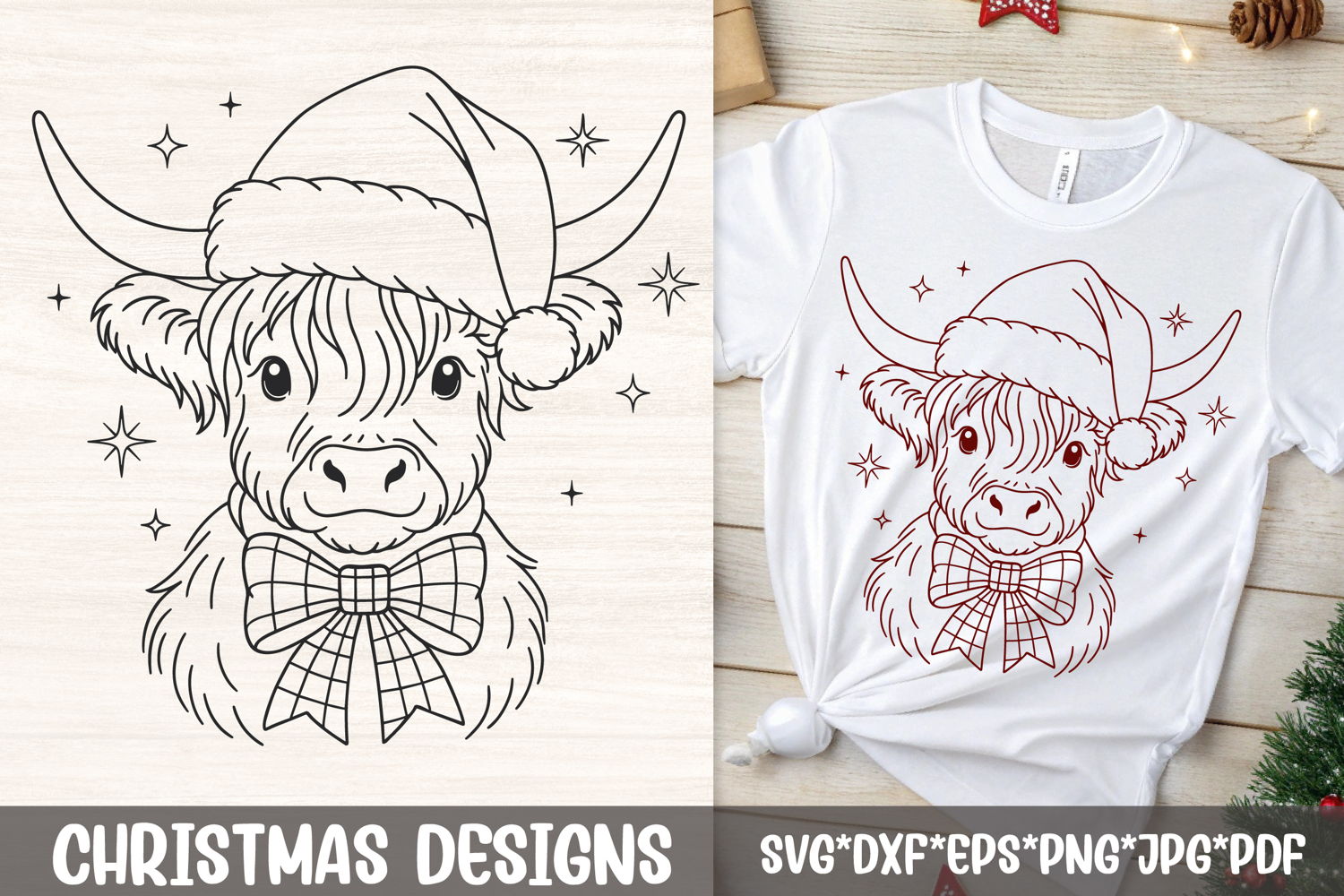 Similar Design Products to Christmas Highland Cow SVG | Santa Hat & Plaid Bow Line Art