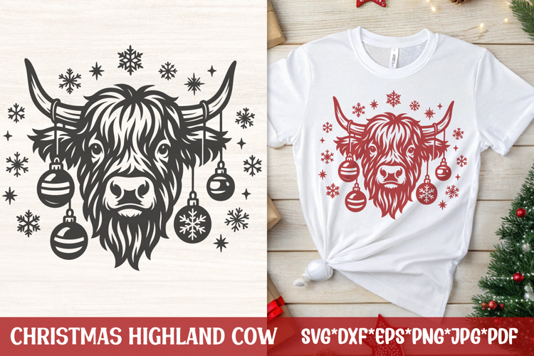 Festive Christmas Highland cow head decorated with hanging baubles and surrounded by snowflakes—perfect for cozy winter t‑shirts, sweatshirts, pajamas, mugs, wood signs, pillows, tote bags and cards. Bold single-color silhouette is clean and cut-friendly for Cricut, Silhouette and laser machines, and also ideal for sublimation and screen printing.