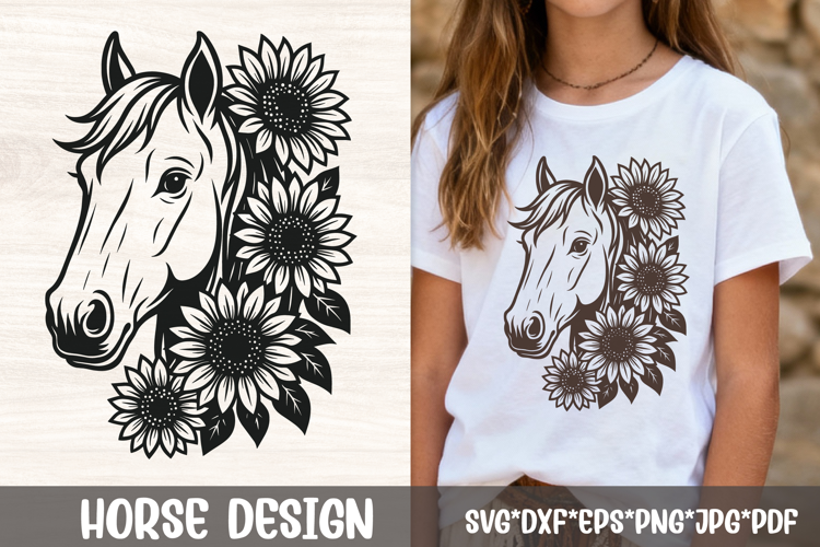 This floral horse SVG features a graceful horse head surrounded by three large sunflowers in bold black line art, perfect for rustic and western t shirts, farmhouse signs, mugs, and tote bags. Ideal for Cricut and Silhouette users who love elegant horse designs for cowgirl apparel, equestrian gifts, and country crafts.