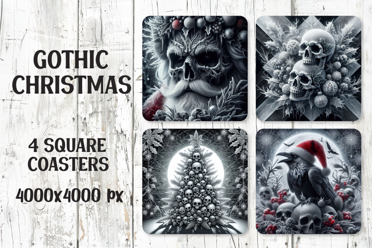 This gothic Christmas coaster includes 4 dark holiday designs: a skull-faced Santa with frosty berries, a skull and ornament arrangement, a skull-covered Christmas tree, and a raven in Santa hat surrounded by skulls and winter foliage. High-resolution square images are perfect for sublimation coasters, mugs, wall art, stickers, cards, and gothic home decor.