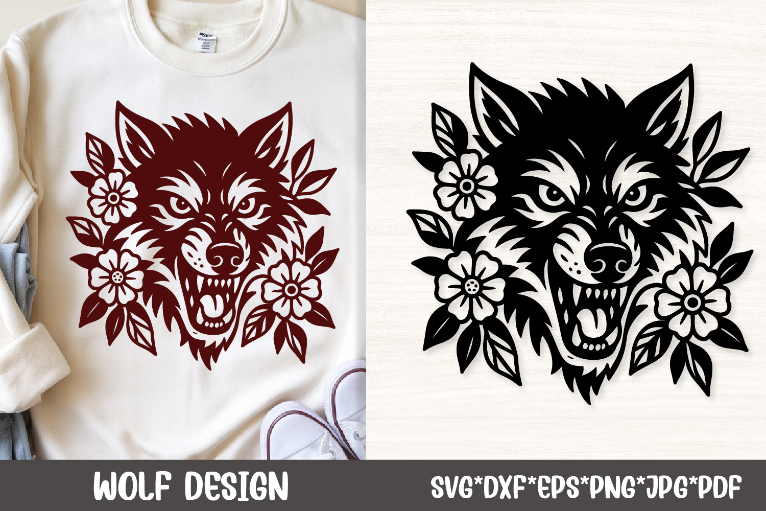 This bold floral wolf SVG features a fierce howling wolf head framed by blooming flowers and leaves, perfect for edgy t shirts, hoodies, tattoos, decals, wall art, and boho western apparel. Ideal for Cricut and Silhouette users who love combining wild nature with feminine floral elements.
