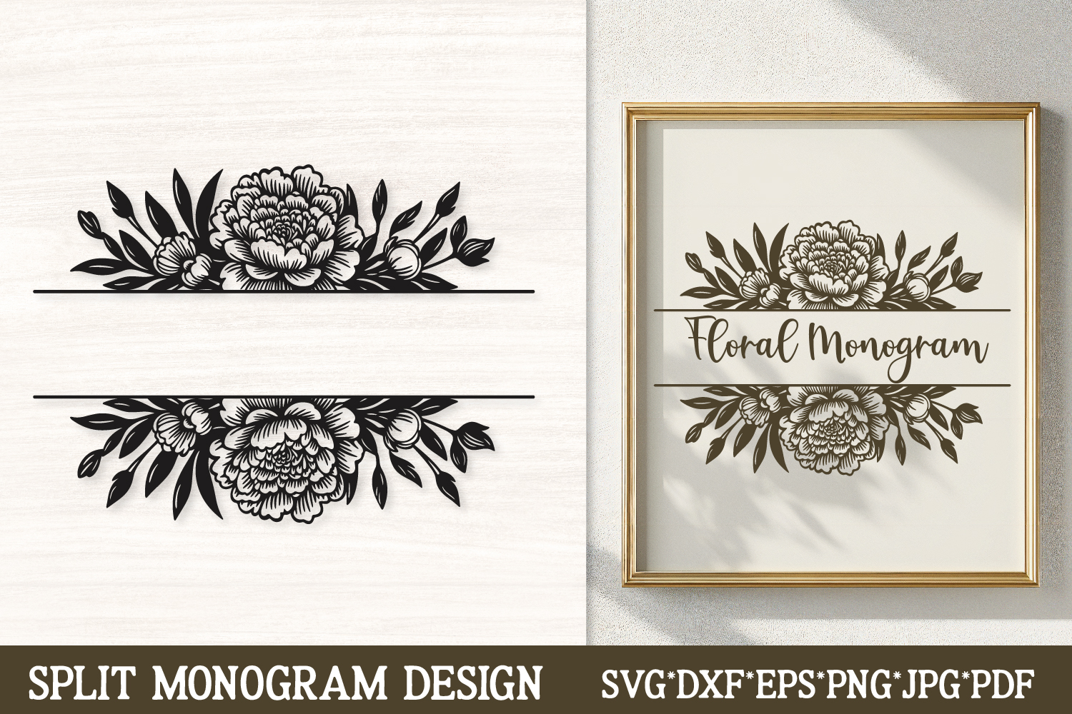 This sophisticated split monogram SVG features detailed peony flowers and leaves framing space for custom initials, perfect for wedding invitations, personalized gifts, signage, stationery, apparel monograms, and luxury branding projects. Ideal for Cricut and Silhouette users creating elegant custom designs.