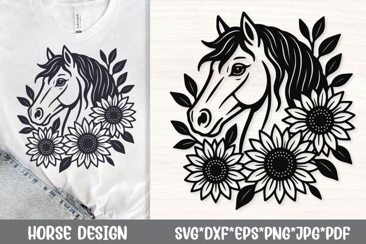 Beautiful horse head SVG featuring a graceful horse surrounded by sunflowers and leaves. This elegant floral horse design symbolizes freedom, strength, and nature. Perfect for farmhouse decor, western crafts, country apparel, laser engraving and wall art.