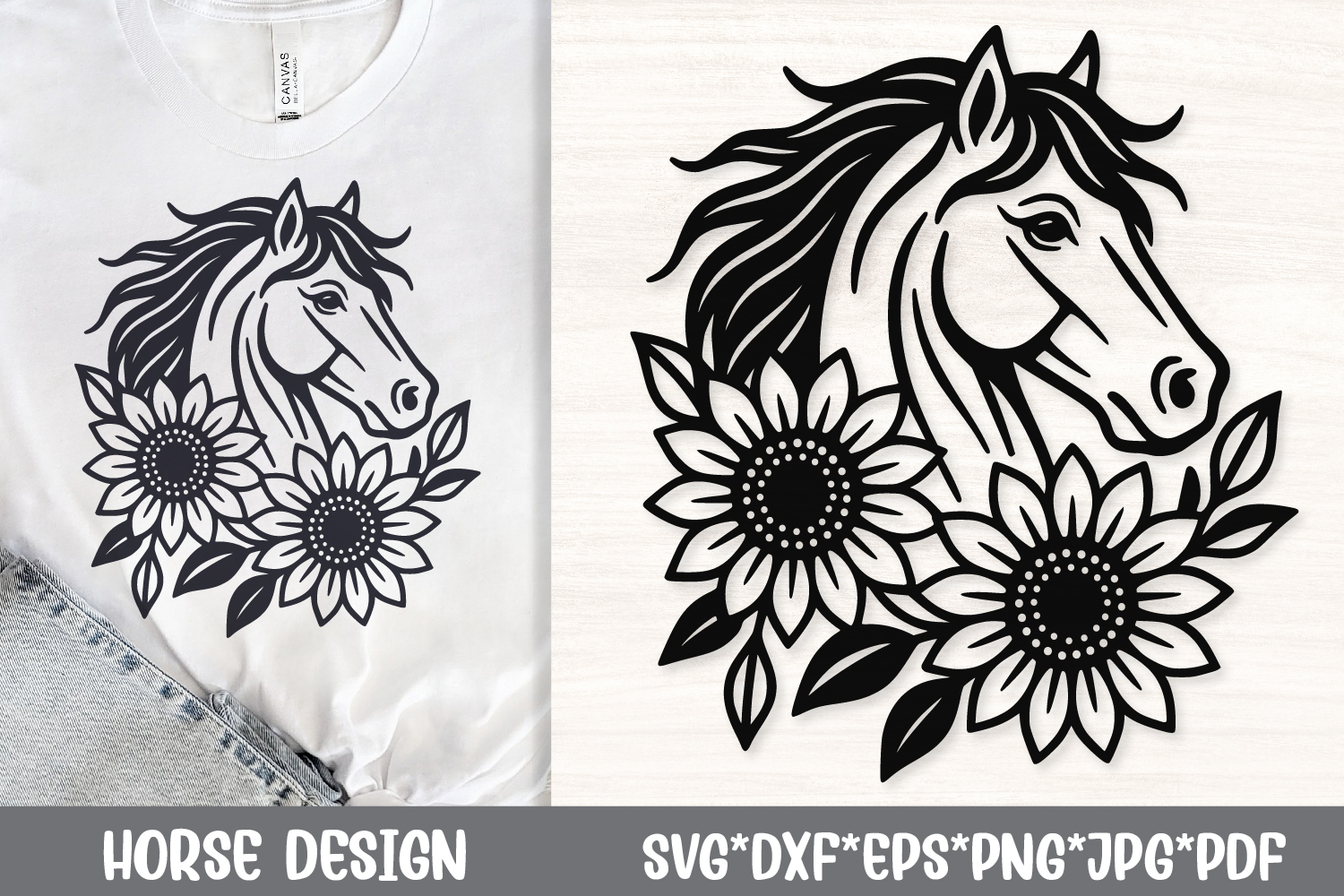 Elegant horse head SVG with sunflowers. Perfect for farmhouse decor, western crafts, country style Cricut and laser projects.