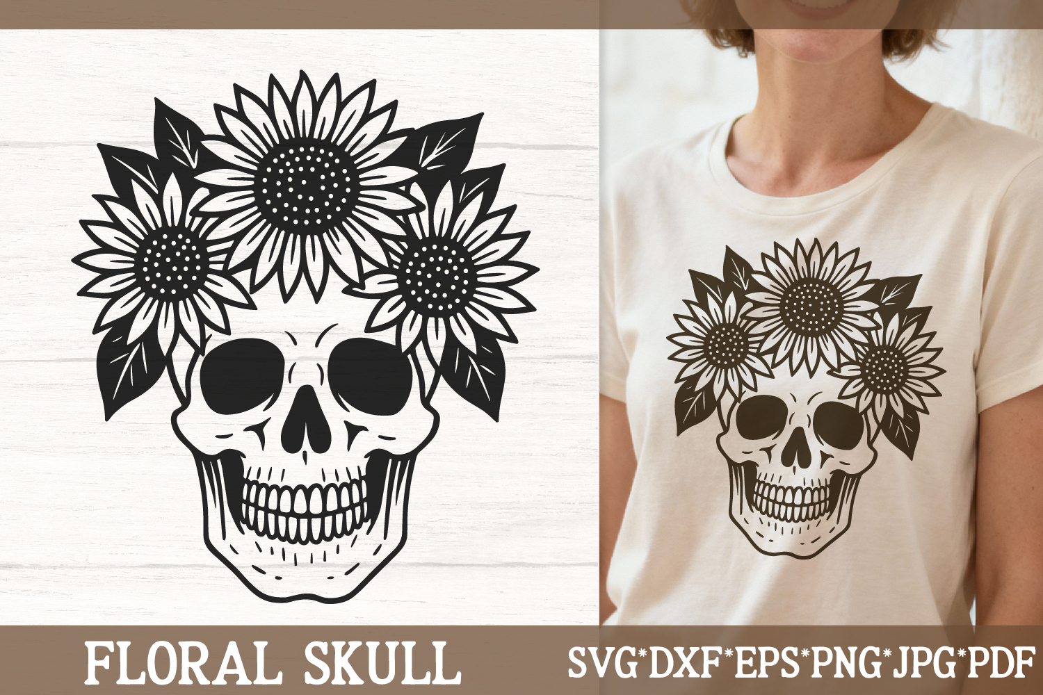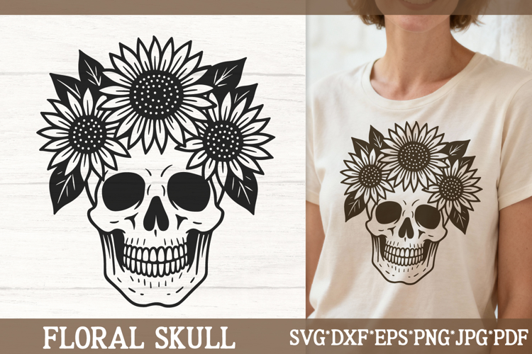 This sunflower skull crown SVG features a detailed skull wearing a wreath of blooming sunflowers and leaves, perfect for boho gothic, farmcore, and alternative summer projects. Ideal for t-shirts, hoodies, stickers, wall art, tumblers, and festival apparel. This vector skull illustration is optimized for Cricut and Silhouette cutting machines.