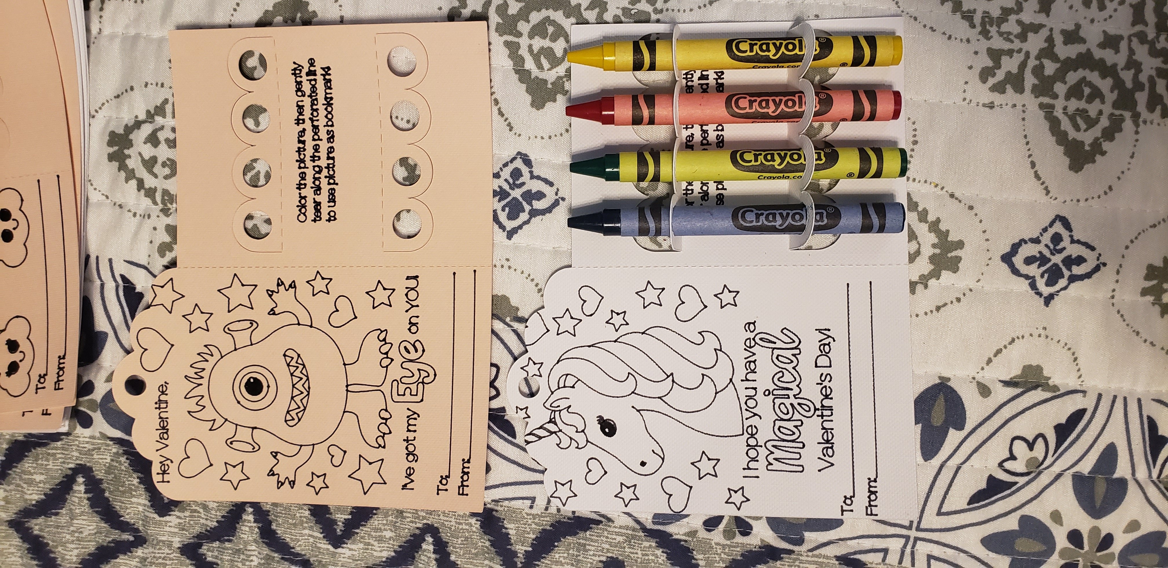 Super fast & easy print then cut DIY crayon holders for classroom Valentines! Set of 4 coloring card crayon holders featuring Unicorn, Cupcakes & Rainbows, Monster, and Rocket Ship coloring designs for kids! After coloring, kids tear along perforation and becomes a bookmark to hold place in their favorite book! Includes 4 hole cards and 2 hole card options!