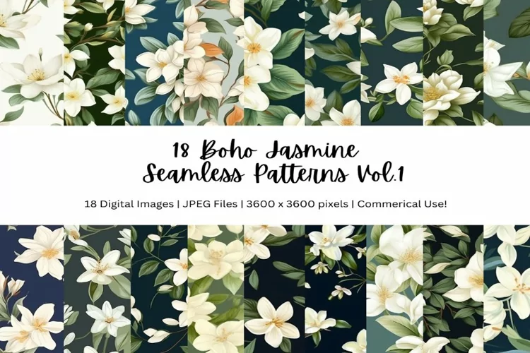 With this digital download, you have instant access to all 18 Boho Jasmine Seamless Patterns. Simply download the files and start incorporating these stunning designs into your projects right away. Let your imagination flourish as you explore the countless possibilities of these captivating flower patterns.