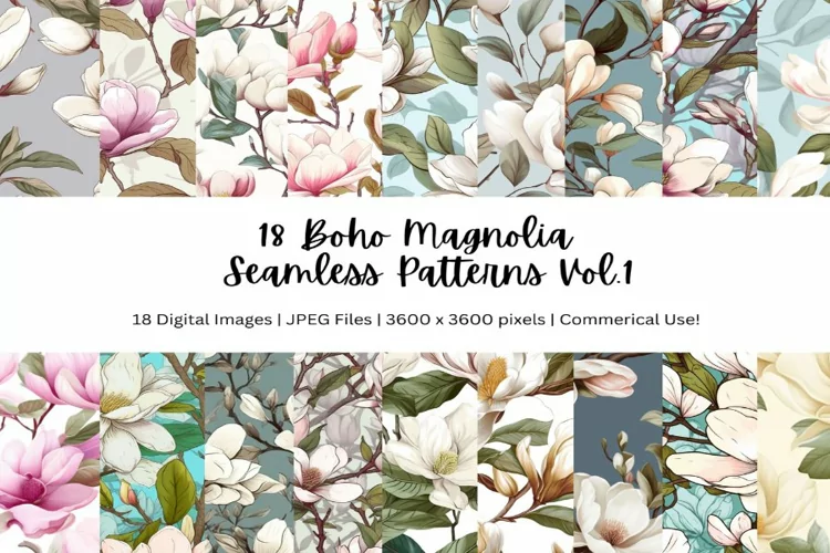 With this digital download, you have instant access to all 18 Boho Magnolia Seamless Patterns. Simply download the files and start incorporating these stunning designs into your projects right away. Let your imagination flourish as you explore the countless possibilities of these captivating flower patterns.