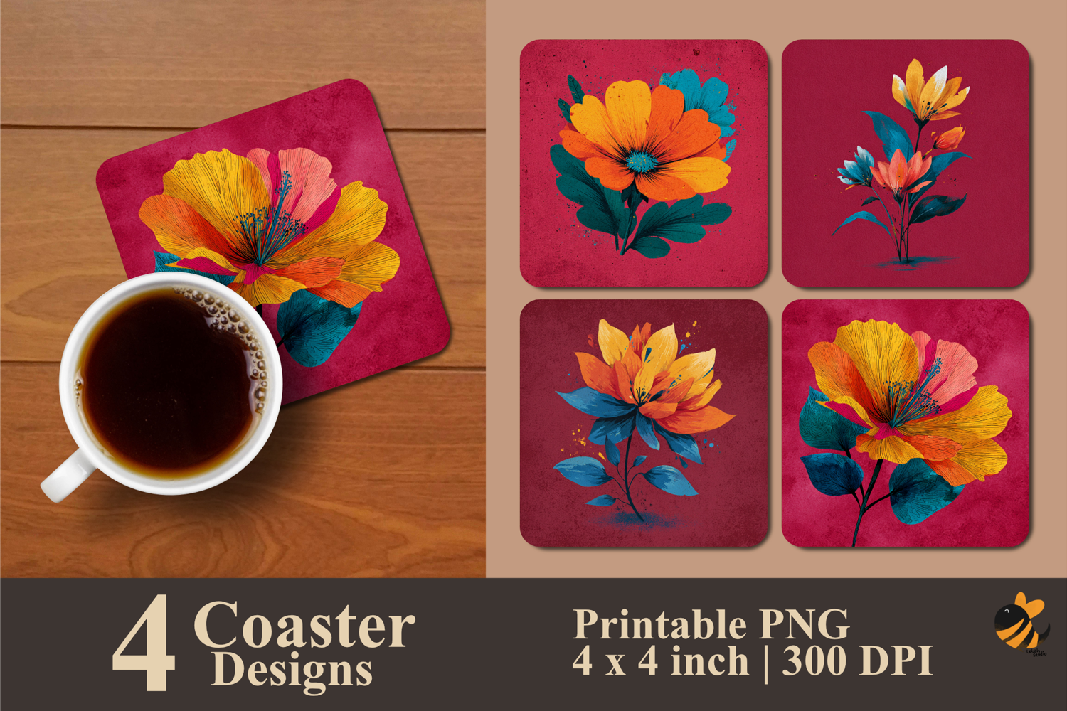 • 4 Coaster design about 4x4 inches around 1200x1200 px PNG files 300 DPI