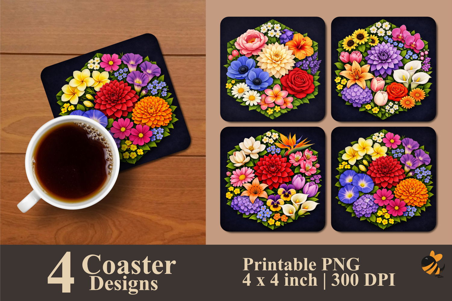 • 4 Coaster design about 4x4 inches around 1200x1200 px PNG files 300 DPI