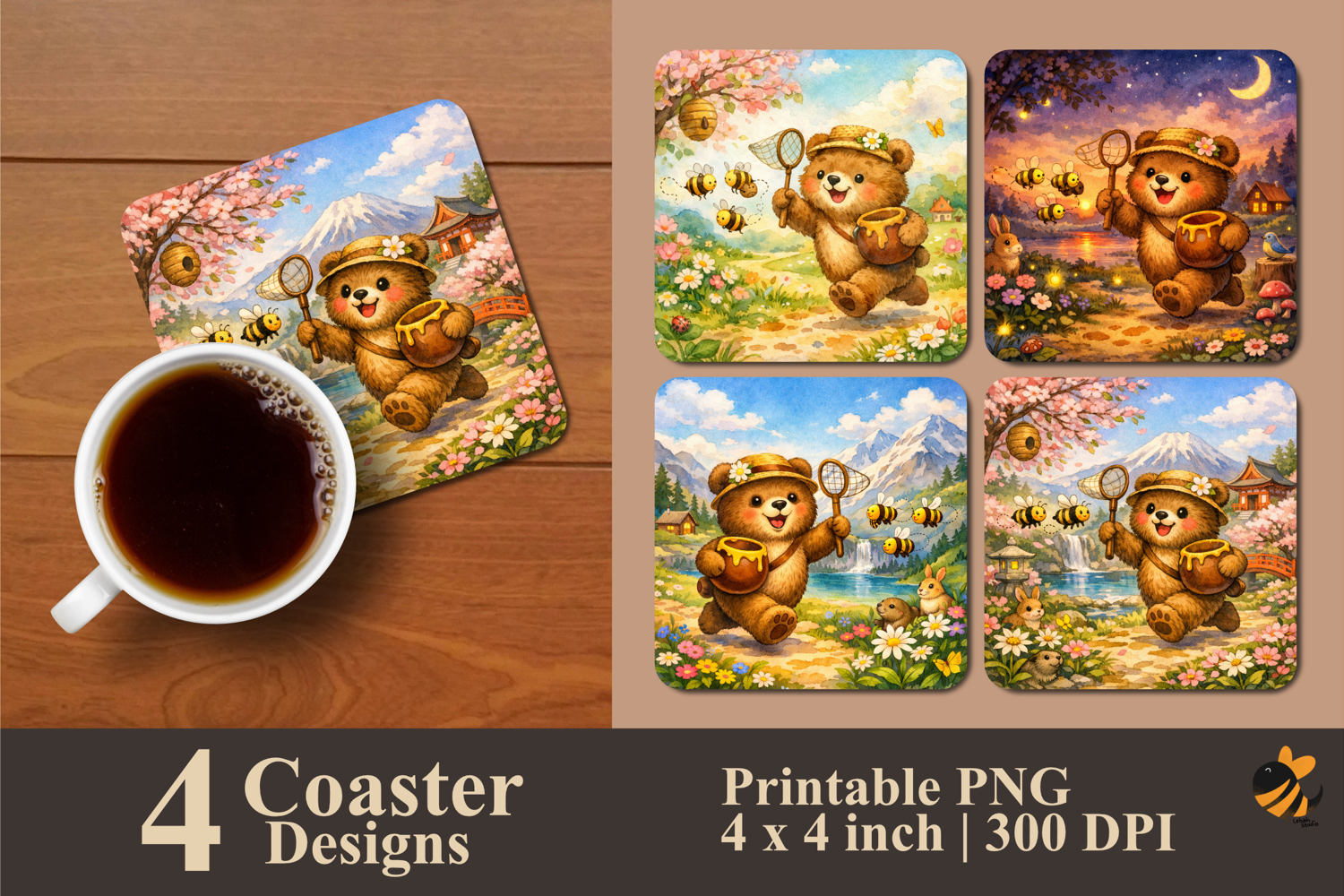 Coaster Sublimation Design Coaster Template Coaster Design Square Coaster Coaster Sublimation Design Coaster Sublimation Vintage Coaster Modern Coaster Bear Chasing Bee Coaster Sublimation Design